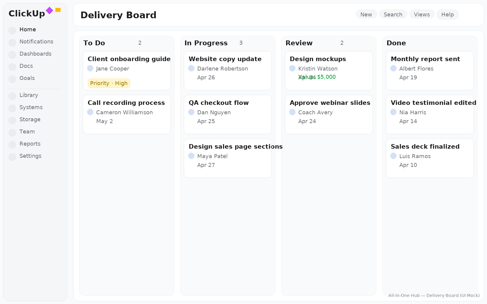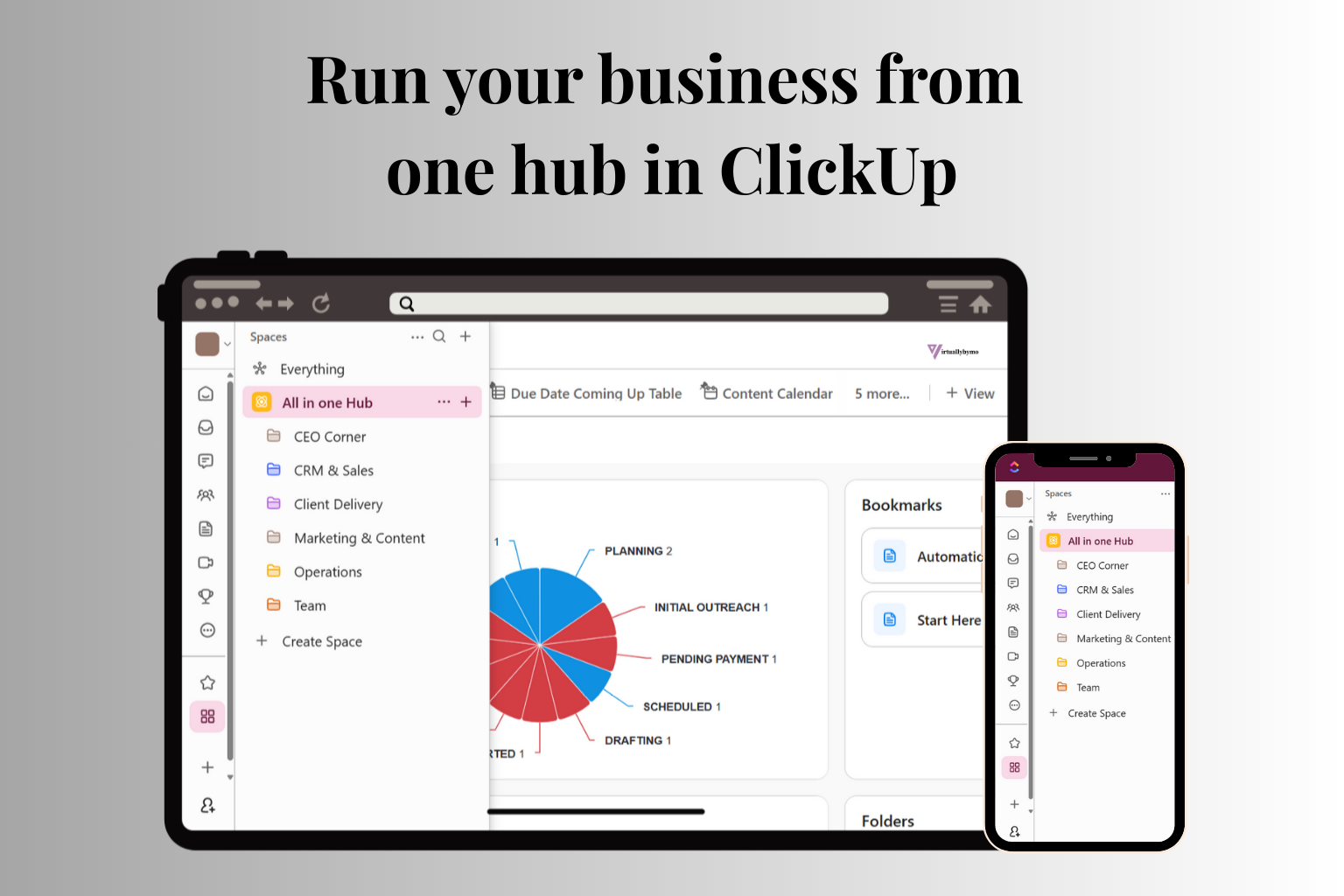 The ClickUp All-in-One Hub is a ready-to-use space designed for coaches, consultants, and service providers who want clarity and structure without incurring thousands of dollars for a custom build. It organizes Sales, Client Delivery, Marketing, Ops, CEO, and Team into one weekly rhythm.