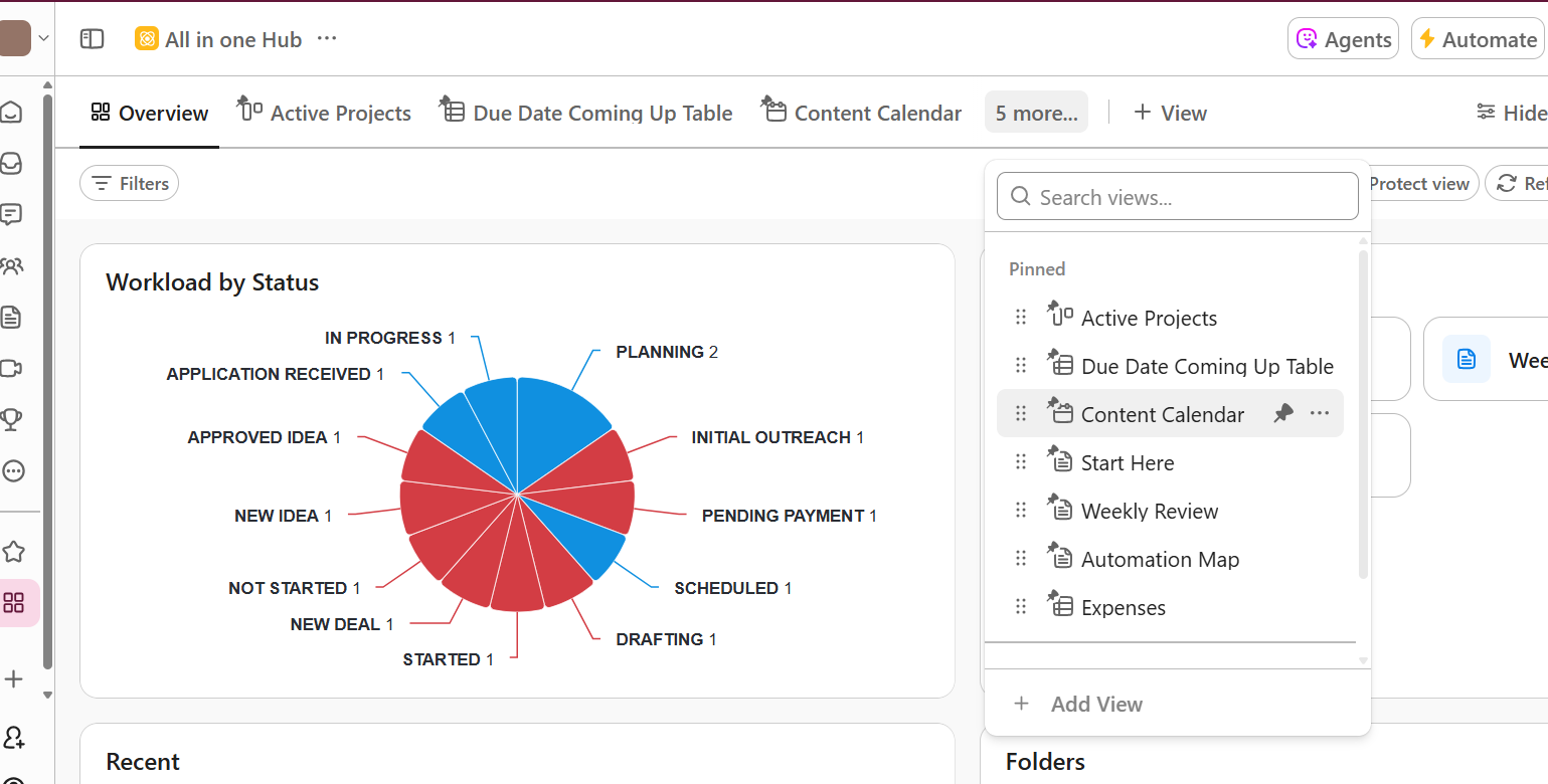 See your whole week at a glance, your sales pipeline by stage, active delivery work by status, a publishing calendar that keeps content on track, a money view that shows invoices and bills in one place, renewal reminders before they sneak up, and a focused “My Week” for the team.